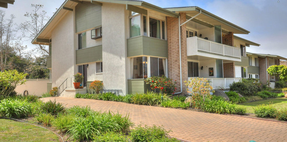 Enjoy expansive mountain views from your beautiful spacious single level home in a quiet private, flat/walkable San Roque neighborhood close to downtown S.B., the Mission, and De La Vina & State restaurants and markets. This rarely available 3 bedroom, 2 full bathroom end-unit features include: a private covered balcony, open dining room, sunny eat- in kitchen, gleaming wood floors, large living room, plantation shutters, built in cabinetry, and loads of storage. It is one of the only units with its own side porch where you can drive and unload groceries or luggage directly into the kitchen. Wonderful 2 car garage w/ cabinets and pool are just steps away. Private garden setting overlooking Mission Creek.In coveted Peabody school district & great low maintenance lock and leave property.